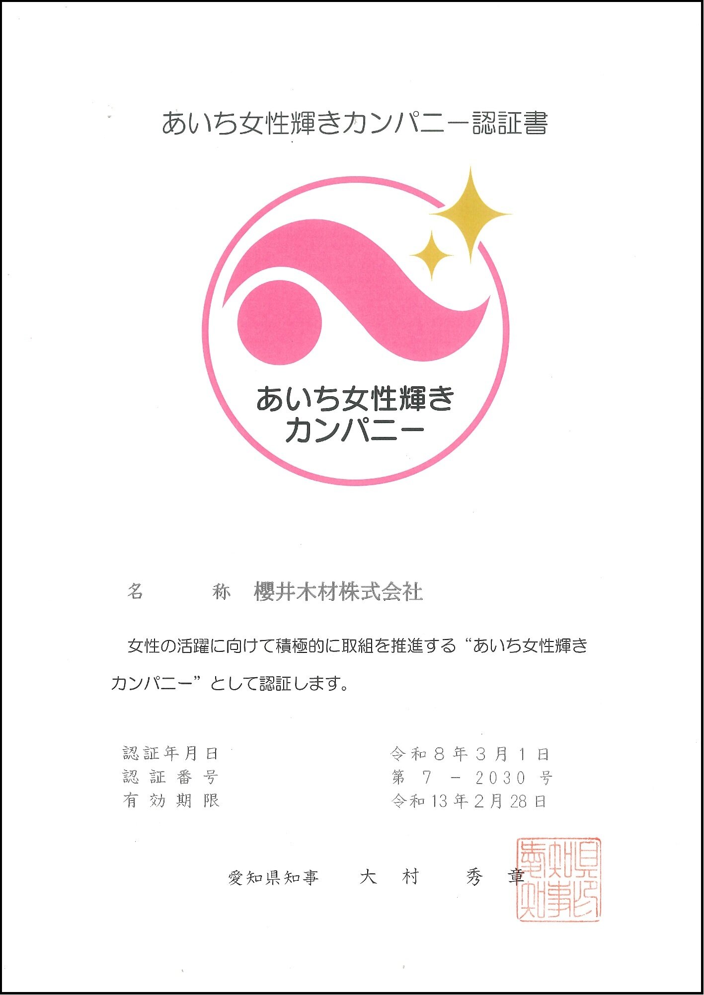 愛知県認証の「あいち女性輝きカンパニー」として認証されましたので、お知らせいたします。